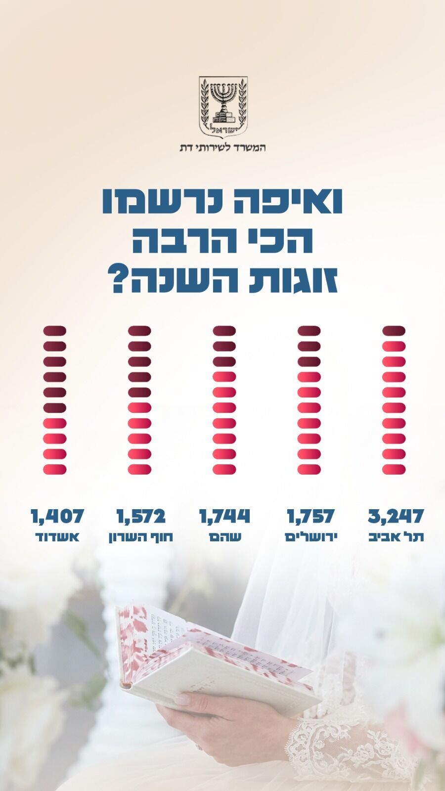 המשרד לשירותי דת פרסם היום את דו"ח סיכום שנת 2025, המציג עלייה כללית של 6% ברישום לנישואין ברחבי הארץ. מנתוני הדו"ח עולה תמונת מצב אופטימית גם בפתח תקווה, בה נרשמו 869 זוגות לנישואין במהלך השנה החולפת.