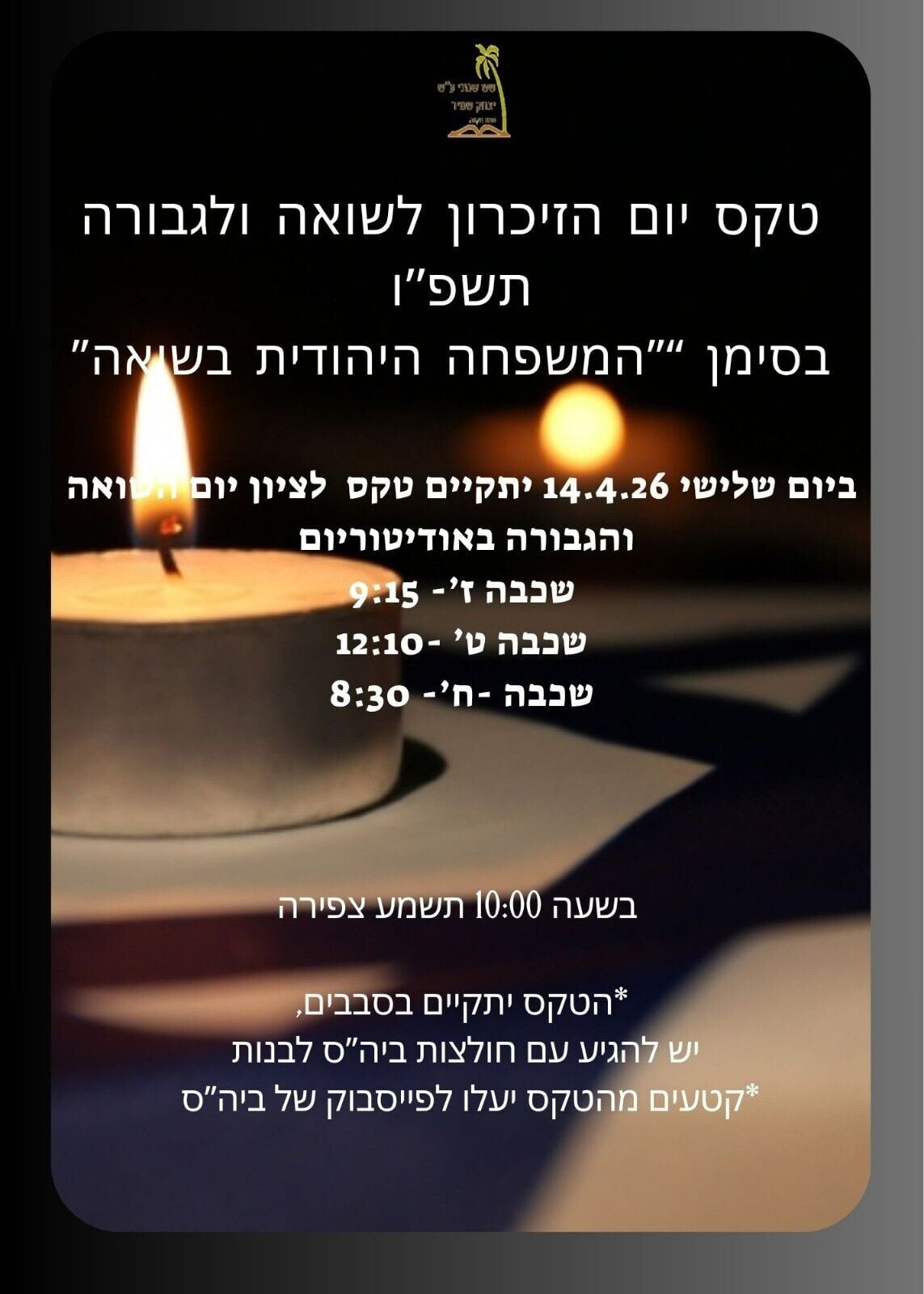 היום (שלישי, 14.4.2026), מציינים בבית הספר באופן רשמי את יום הזיכרון לשואה ולגבורה לשנת תשפ"ו במעגלי שיח וטקסי זיכרון במתחם האודיטוריום של המוסד. השנה, הטקסים עומדים בסימן "המשפחה היהודית בשואה".