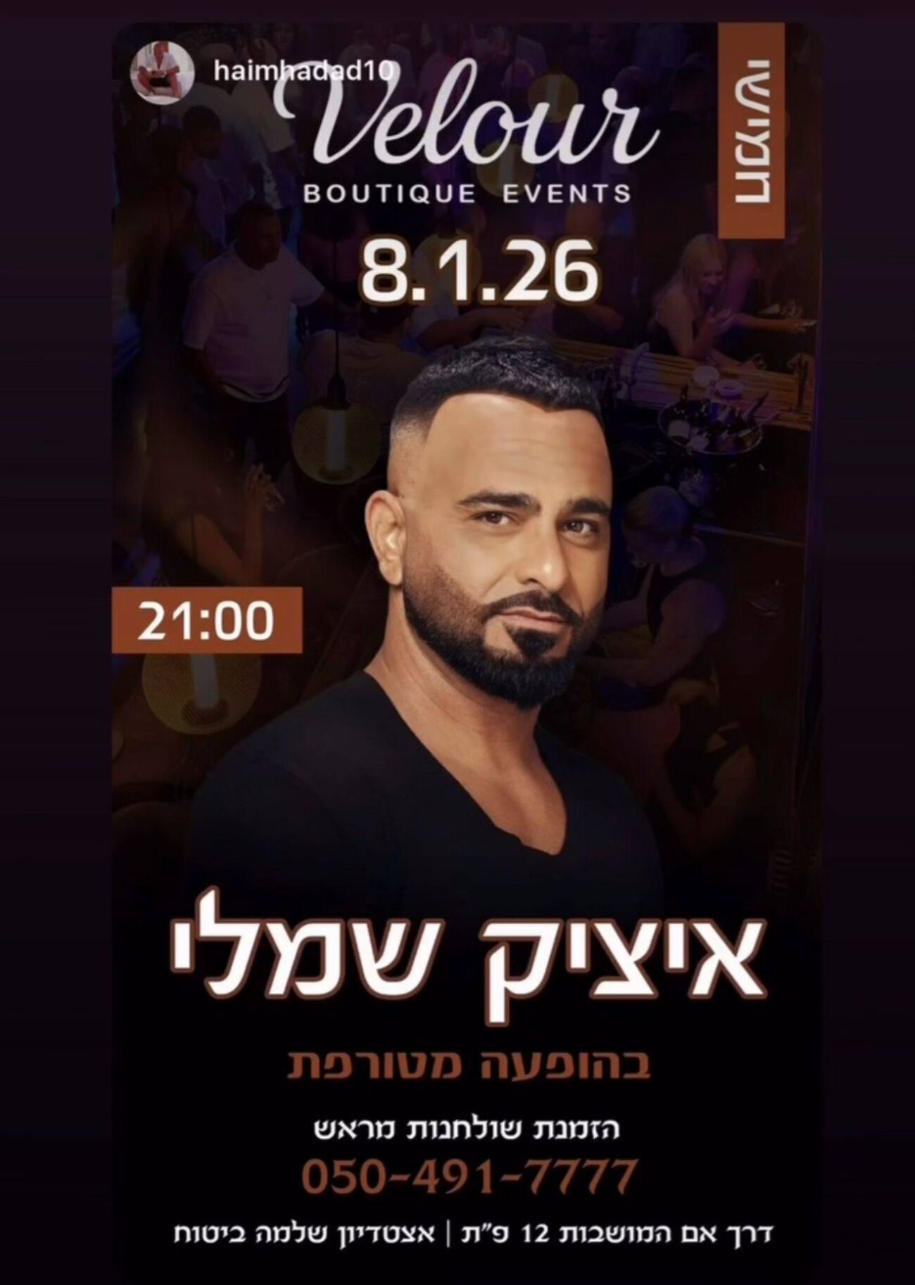השבוע צפויות הופעות של הזמר איציק שמלי ביום חמישי, ובמוצאי שבת יופיע הזמר אודי צברי.