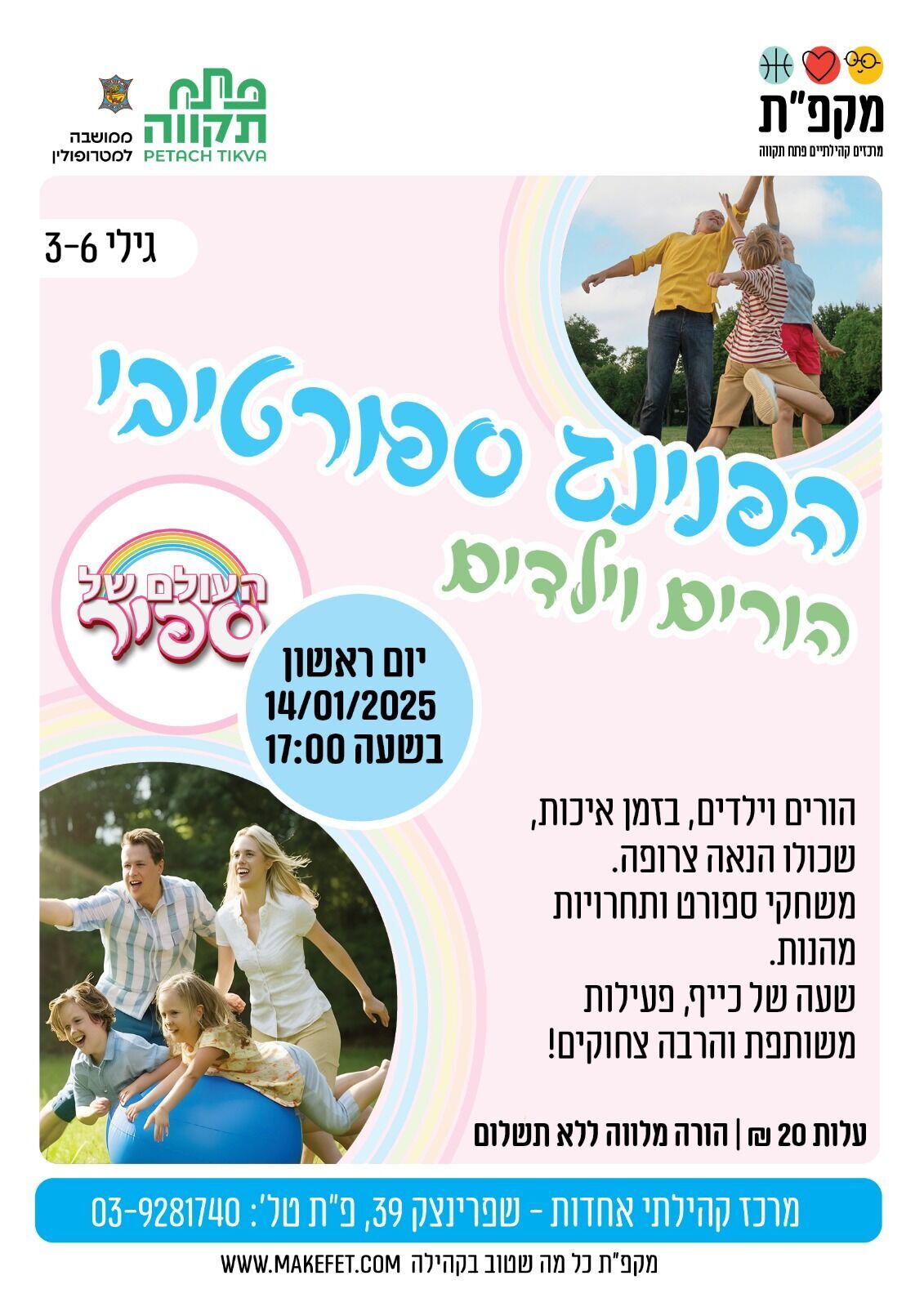 - 14 בינואר: הפנינג ספורטיבי לגילאי 3-6 עם העולם של ספיר. יום שלישי בשעה 17:00. עלות: 20 ש"ח (הורה ללא תשלום).