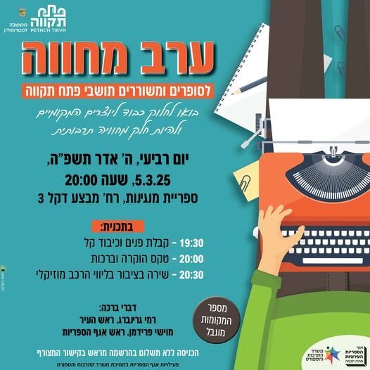 אגף הספריות העירוניות בפתח תקווה מזמין את תושבי העיר לערב מיוחד של מחווה והוקרה למשוררים וסופרים תושבי העיר. האירוע יתקיים ביום רביעי, ה' באדר תשפ"ה (5 במרץ 2025), בספריית "מנגינות" ברחוב מבצע דקל 3, נווה גן, פתח תקווה.