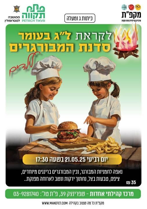 לכבוד ל"ג בעומר: סדנת המבורגרים לילדי כיתות ג' ומעלה תתקיים במרכז קהילתי אחדות בפתח תקווה ב-21.5.25