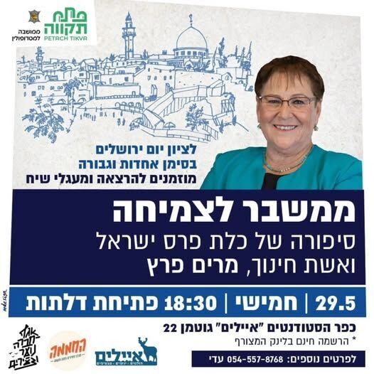 החממה מרכז צעירים פתח תקוה מזמינים: מרים פרץ בהרצאה "ממשבר לצמיחה" ומעגלי שיח לציון יום ירושלים בסימן אחדות וגבורה ב-29.5
