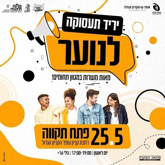 אגף חברה, נוער וצעירים פתח תקוה הודיע על קיומו של יריד תעסוקה שיתקיים ביום ראשון, 25 במאי. ברחבת קניון עופר הקניון הגדול 17:00 - 19:00 לגילאי 16 +