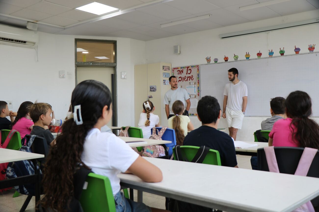 שחקני הפועל 'מבנה' פתח-תקוה, עומר כץ ועוז פרץ, הגיעו לביקור בבית הספר אריק איינשטיין בפתח תקוה וחילקו תיקים לתלמידי כיתה ד'