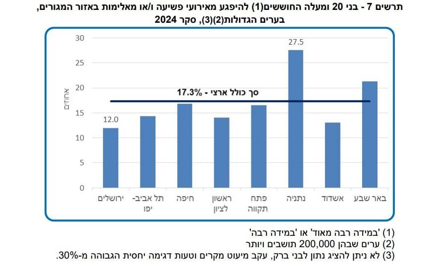 עוד עולה מהסקר כי 17.3% מהתושבים חוששים להיפגע מאירועי פשיעה או אלימות באזור מגוריהם. החשש הגבוה ביותר נרשם בנתניה (27.5%), ואחריה באר שבע (21.3%). פתח תקווה נמצאת מתחת לממוצע הארצי עם כ-16.5%. החשש הנמוך ביותר נרשם בירושלים, עם 12% בלבד.