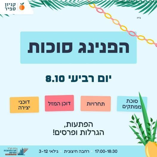 קניון ספיר בשכונת אם המושבות בפתח תקווה יקיים חגיגת סוכות צבעונית לכל המשפחה. האירוע יתקיים ביום רביעי, 8 באוקטובר, בין השעות 17:00 ל-18:30 ברחבה החיצונית של הקניון.