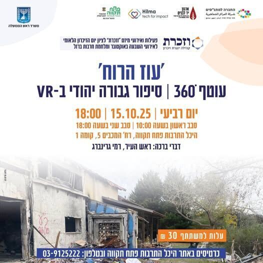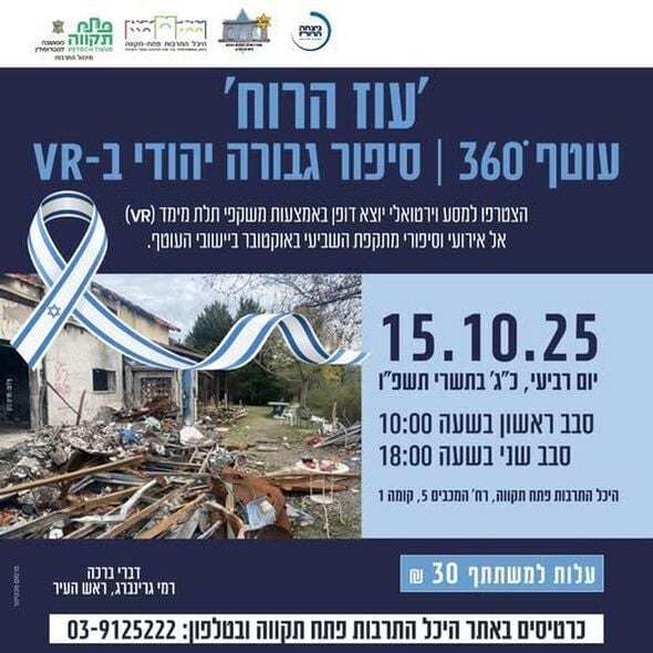 שנתיים ל7 באוקטובר! היום (רביעי 15.10) יתקיים בהיכל התרבות פתח תקווה מיזם עוז הרוח" עוטף 360°, שיציע למשתתפים מסע וירטואלי יוצא דופן באמצעות משקפי תלת מימד עם אירועי וסיפורי מתקפת השביעי באוקטובר ביישובי העוטף- יש לבצע הרשמה