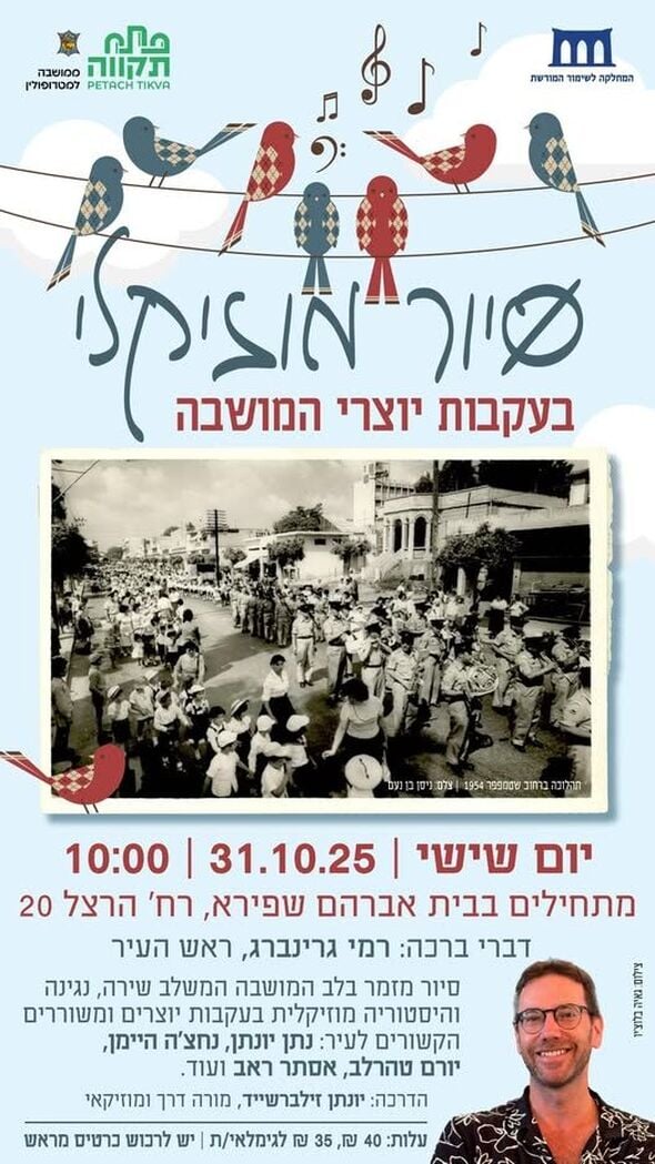 ביום שישי 31.10 יתקיים סיור מוזיקלי בעקבות היוצרים והיוצרות של פתח תקווה בהדרכת יונתן זילברשייד - מורה דרך ומוזיקאי