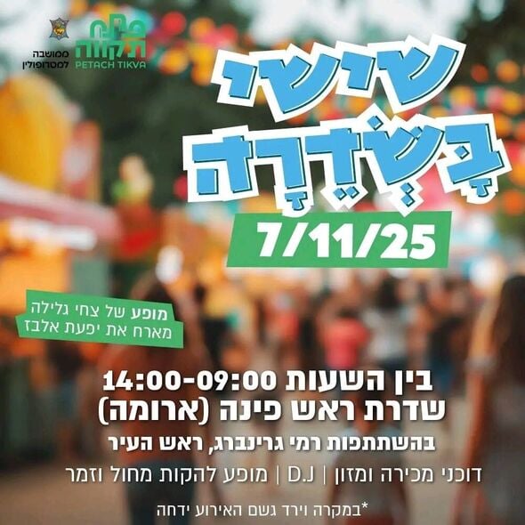 פתח תקווה: ביום שישי 7.11 יתקיים בשדרת ראש פינה אירוע שישי בשדרה עם דוכנים, מופע של צחי גלילה ויפעת אלבז ועוד הפתעות