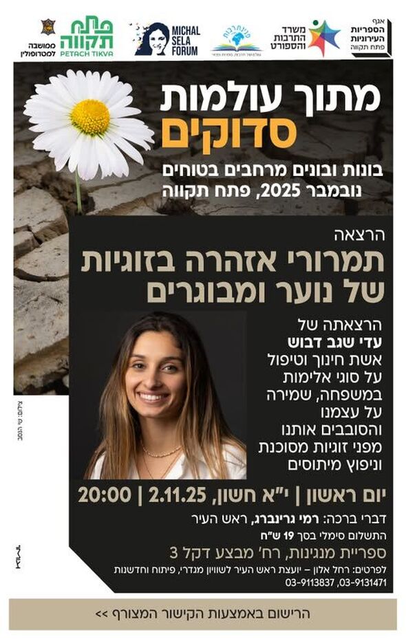 ביום ראשון 2.11 תתקיים הרצאתה של עדי שגב דבוש, אשת חינוך וטיפול במסגרת אירוע חודש להעלאת המודעות למניעת אלימות בפתח תקווה
