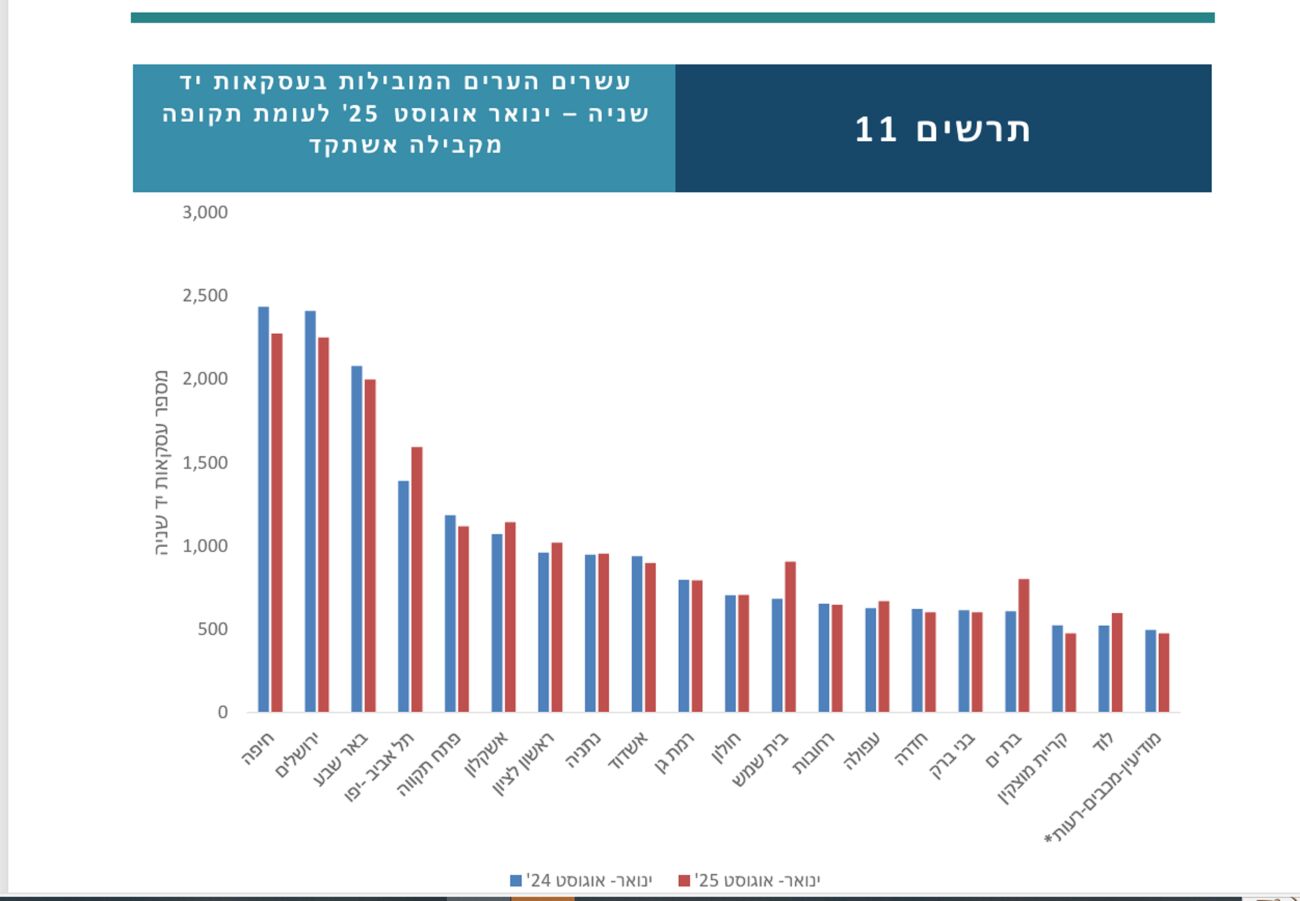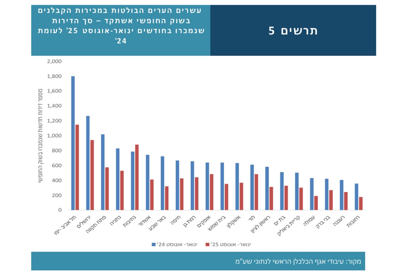 כאשר מסתכלים על הפילוח על פי ערים (20 הערים המובילות) במכירת דירות בשוק החופשי בין ינואר לאוגוסט 2025 הנתונים מראים כי רק בנתיבות חל גידול במכירות- יש לציין כי עיר זו היא בעלת העיר עם שכיכות גבוהה של מירות עם הטבות מימון.
