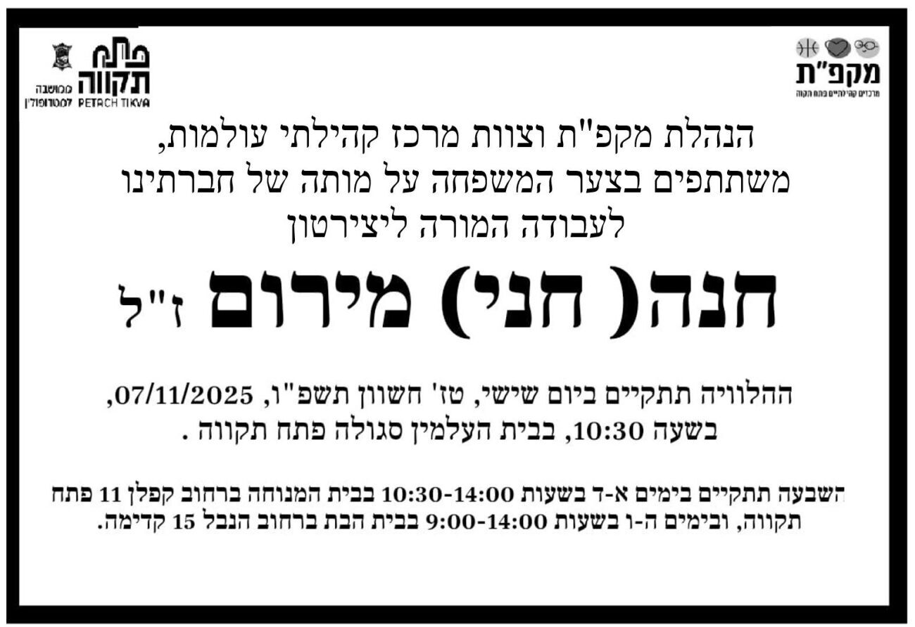 אבל בפתח תקווה: חני מירום, מדריכת חוג 'יצירטרון' האהובה וכלת תואר יקירת העיר, הלכה לעולמה