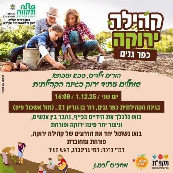 קהילת "ירוקה כפר גנים" בפתח תקווה מזמינה את הציבור הרחב, כולל משפחות, סבים, סבתות וילדים, לאירוע שתילה קהילתי שמטרתו לקדם עתיד ירוק ובריא.