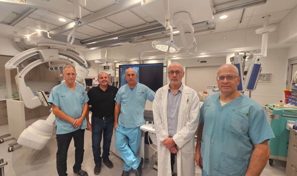 צילום:ד״ר גיא רפאלי, מנהל יחידת השבץ ומצנתר מוח בכיר, פרופ׳ איתן אוריאל, מנהל המחלקה לנוירולוגיה, פרופ׳ שגיא הרנוף, מנהל המחלקה הנוירוכירורגית, תמיר נחמיאס, דימותן רפואי אבחון ראשי וארצי, פרופ׳ אלי עטר, מנהל מערך הדימות.