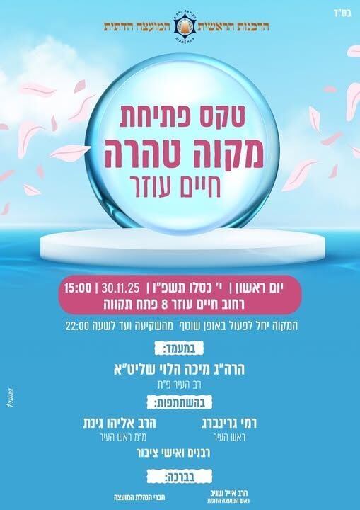 המועצה הדתית פתח תקווה מזמינה את הציבור לטקס פתיחת מקווה הנשים 'חיים עוזר' שיתקיים ביום ראשון ה-30/11 בשעה 15:00