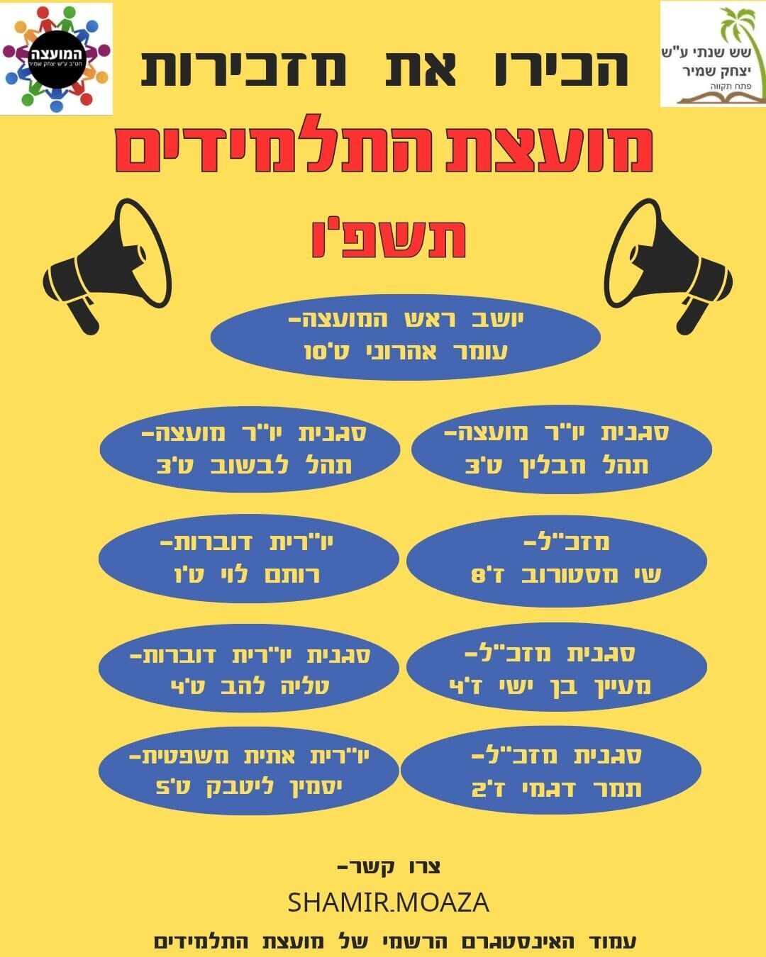 בנוסף לבחירתו של אהרוני, נקבע כי התלמידות תהל ל. ותהל ח. מכיתה ט' 3 ישמשו כסגניות היושב ראש. השתיים צפויות להוביל את מועצת התלמידים יחד עם אהרוני במהלך השנה הקרובה. בית הספר איחל הצלחה רבה לזוכים ולכל נציגי מועצת התלמידים של חטיבת שמיר בפעילותם.
