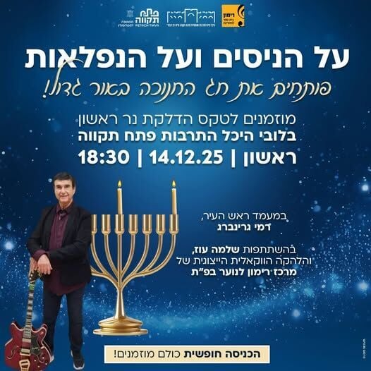 עיריית פתח תקווה מזמינה את הציבור הרחב לפתוח את חג החנוכה בטקס חגיגי של הדלקת נר ראשון. האירוע יתקיים בלובי היכל התרבות בעיר.