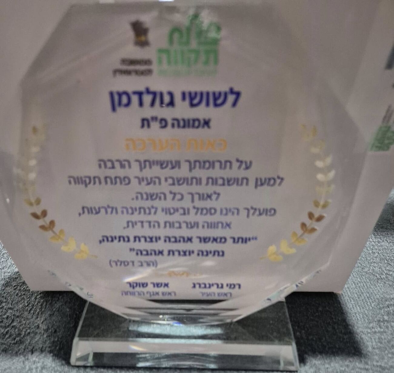 אות המתנדב המצטיין הוענק לשושי גולדמן וחוי צמחוני מארגון אמונה פתח תקווה