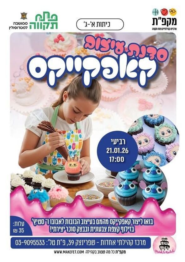 סדנת עיצוב קאפקייקס מיוחדת לכיתות א'-ג' תתקיים במרכז קהילתי אחדות בפתח תקווה ביום רביעי ה-21.1.26