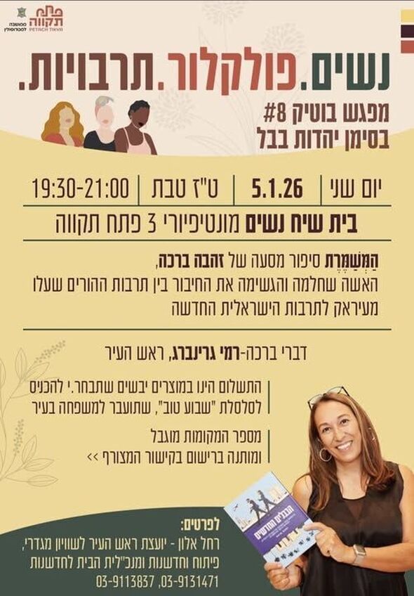 ערב תרבות בפתח תקווה: זהבה ברכה תגיע לבית שיח נשים למפגש מיוחד בנושא שימור השפה העיראקית בסימן בבל ב-5 בינואר