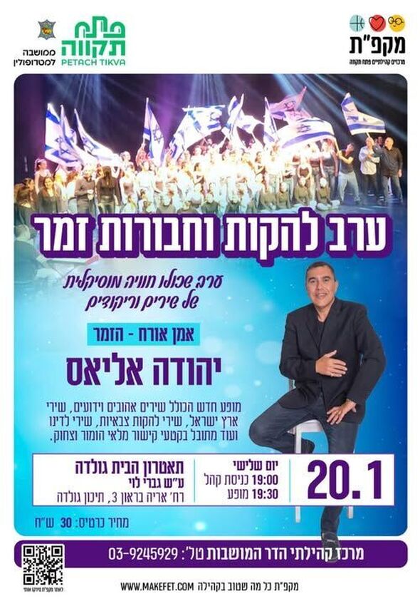 ערב להקות וחבורות זמר במקפ"ת הדר המושבות: מופע של יהודה אליאס ודברי ברכה מראש העיר ב-20.1.25