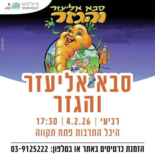 הצגת הילדים הקלאסית "סבא אליעזר והגזר" תגיע להיכל התרבות בפתח תקווה ביום רביעי ה-4.2.26