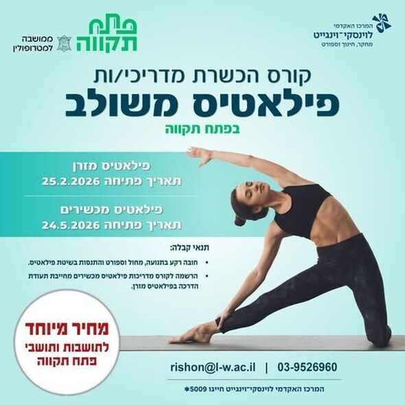 עיריית פתח תקווה פותחת את ההרשמה לקורסי הכשרת מדריכי פילאטיס מזרן ומכשירים במחיר מסובסד לתושבים בשיתוף המרכז האקדמי לוינסקי-וינגייט - פתיחה בפברואר ומאי 2026