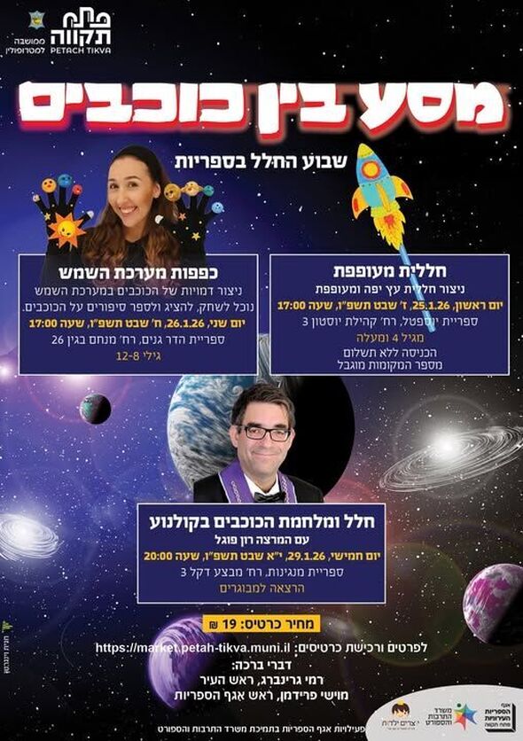 למחרת, ביום שני ה-26.1.26 בשעה 17:00, תיערך הפעילות "כפפות מערכת השמש" בספריית הדר גנים (רחוב מנחם בגין 26). האירוע מיועד לגילאי 8 עד 12 ויכלול יצירת דמויות של כוכבי מערכת השמש, משחקים וסיפורים על הכוכבים. לפרטים נוספים ורכישת כרטיסים ניתן להיכנס לקישור: לחצו כאן.