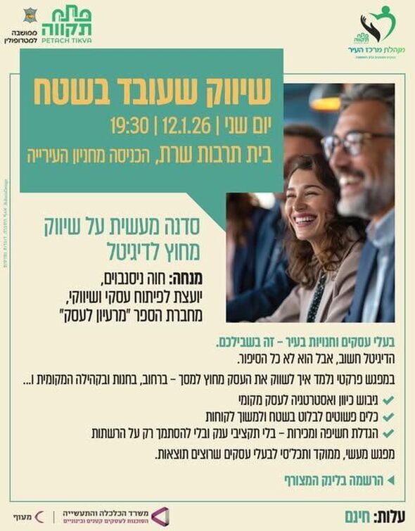 עיריית פתח תקווה מזמינה את בעלי העסקים והחנויות בעיר למפגש מקצועי ופרקטי, המתמקד בשיווק העסק מחוץ למרחב הדיגיטלי. המפגש נועד להעניק כלים לשיווק ברחוב, בחנות ובקהילה המקומית, מתוך הבנה כי הדיגיטל חשוב אך אינו חזות הכל.