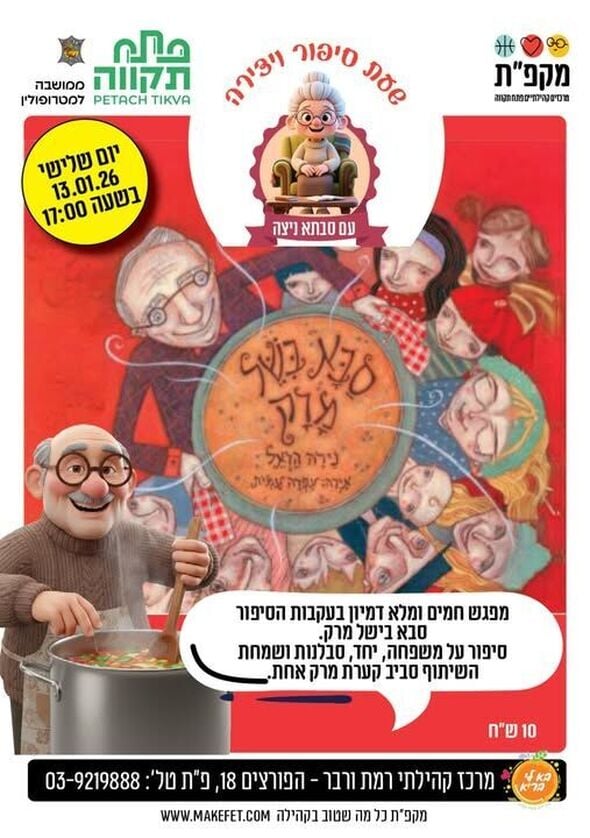 מרכז קהילתי רמת ורבר בפתח תקווה מזמין את הילדים וההורים לשעת סיפור ויצירה עם "סבתא ניצה". המפגש יתמקד בסיפור "סבא בישל מרק" ויציע חוויה של דמיון וערכים.