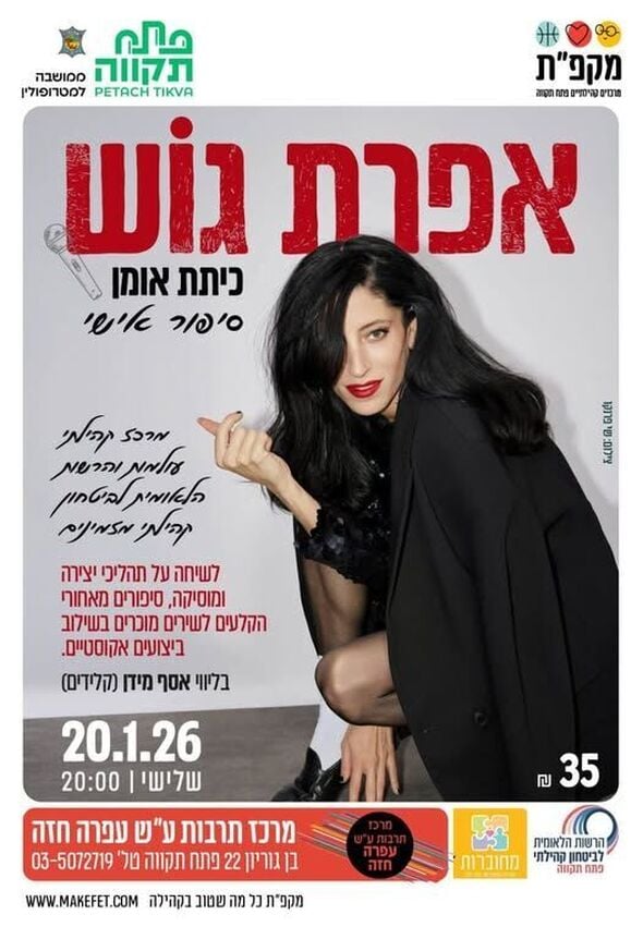 מתנ"ס עולמות והרשות לביטחון קהילתי בפתח תקווה מזמינים את הציבור לערב מיוחד עם הזמרת והיוצרת הישראלית, אפרת גוש.