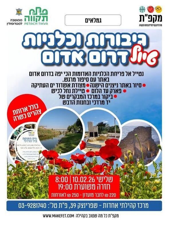 טיול "גיבורות וכלניות" לגמלאים: מרכז קהילתי אחדות פתח תקווה מזמין לסיור בדרום אדום הכולל ביקור באתרי מורשת וארוחת צהריים ביום שלישי 10/2