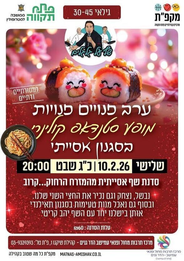 ערב פנויים פנויות למגזר הדתי והמסורתי בגילאי 30-45 יתקיים במתנ"ס עמישב בפתח תקווה ב-10.02 במרכז התוכנית יעמוד מופע סטנדאפ בבישול בסגנון אסייתי-תאילנדי בהנחיית השף יהב קריטי
