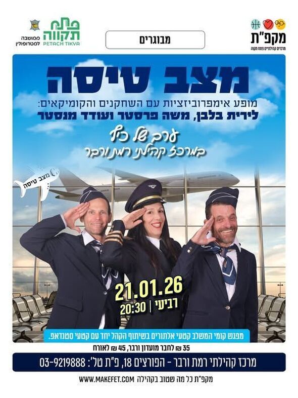 מופע אימפרוביזציות וסטנדאפ במרכז קהילתי רמת ורבר בפתח תקווה: לירית בלבן, משה פרסטר ועודד מנסטר מגיעים להופעה ב-21.01.26