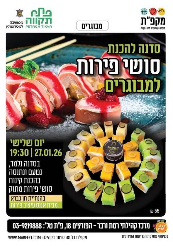סדנה חווייתית להכנת סושי פירות למבוגרים תתקיים במרכז קהילתי רמת ורבר בפתח תקווה ב-27.01.26