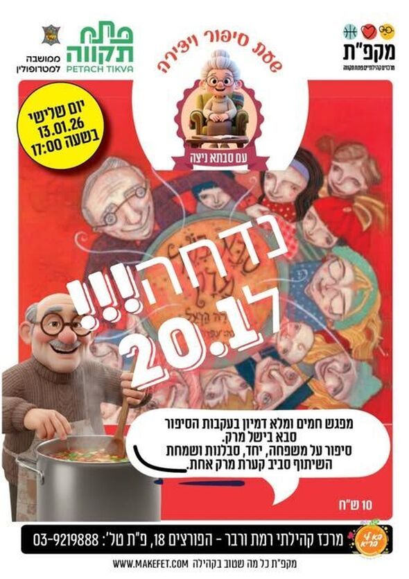 מרכז קהילתי רמת ורבר בפתח תקווה מזמין את הילדים וההורים לשעת סיפור ויצירה עם "סבתא ניצה". המפגש יתמקד הפעם בסיפור האהוב "סבא בישל מרק".