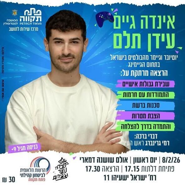 הרשות הלאומית לביטחון קהילתי בפתח תקווה, בשיתוף אגף הנוער והמתנ"סים תקומה ועין גנים, מזמינים את בני הנוער למפגש מיוחד עם עידן תלם, המוכר כ"אינדה גיים". תלם נחשב לאחד היוטיוברים והגיימרים הבולטים בישראל בתחום הגיימינג.