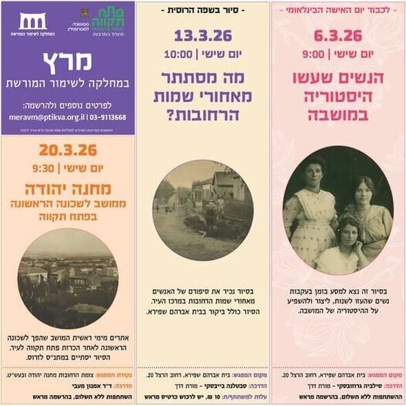 המחלקה לשימור המורשת בעיריית פתח תקווה פרסמה את לוח הסיורים ההיסטוריים המתוכננים לחודש מרץ 2026. התוכנית כוללת מגוון סיורים ברחבי העיר המיועדים לקהל הרחב וחושפים את עברה המרתק של פתח תקווה.