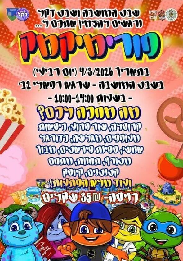 שבטי הצופים "המושבה" ו"דקל" יקיימו אירוע פורים חגיגי לילדי פתח תקווה. האירוע, המכונה "פורימון מיקמק", צפוי להתקיים ביום רביעי, 4 במרץ 2026.