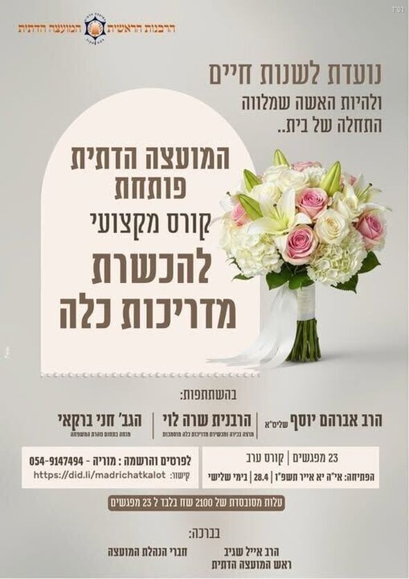 המועצה הדתית בפתח תקווה הודיעה על פתיחת קורס מקצועי ומקיף להכשרת מדריכות כלה. הקורס נועד לנשים המעוניינות להדריך וללוות כלות בצעדיהן הראשונים לקראת הקמת בית, ולהיות, כפי שמתואר, מלוות התחלה של בית.