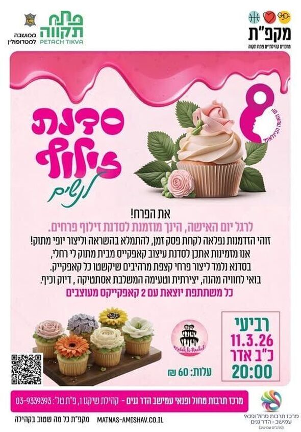 לרגל יום האישה הבינלאומי, יקיים מתנ"ס עמישב הדר גנים בפתח תקווה סדנת זילוף פרחים על קאפקייקס המיועדת לנשים. האירוע ייערך ביום רביעי, 11 במרץ 2026, החל מהשעה 20:00.