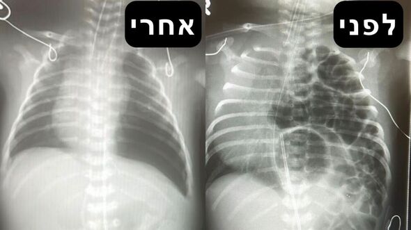 בצילומי החזה שבוצעו לפני ההתערבות הכירורגית מודגמות לולאות מעי בתוך חלל בית החזה של התינוק. לאחר הניתוח הצליחו הצוותים לתקן את הסרעפת ולהחזיר את הקיבה, הטחול, המעי הדק והמעי הגס אל מקומם הטבעי והתקין בחלל הבטן.