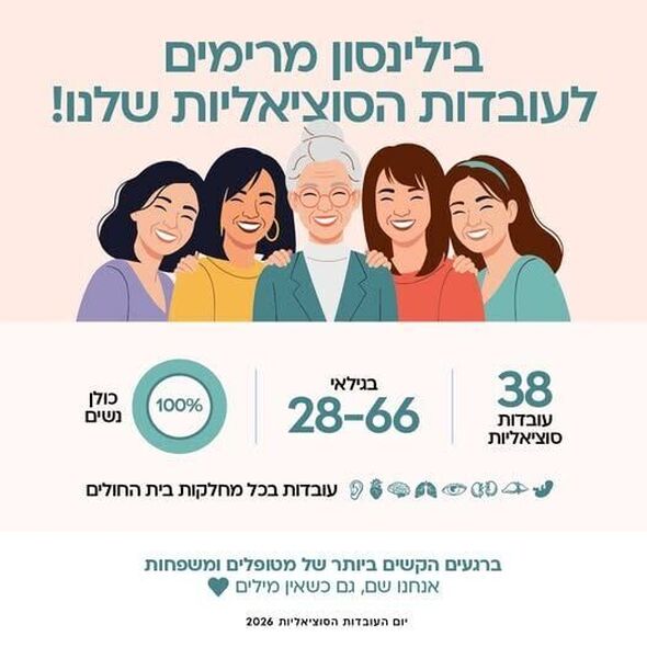 מנתוני בית החולים עולה כי מערך העבודה הסוציאלית בבילינסון מורכב כולו מנשים - 100 אחוזים מצוות המערך. בבית החולים פועלות 38 עובדות סוציאליות, בטווח הגילאים 28 עד 66, אשר משולבות ומעניקות ליווי צמוד בכלל מחלקות המרכז הרפואי.
