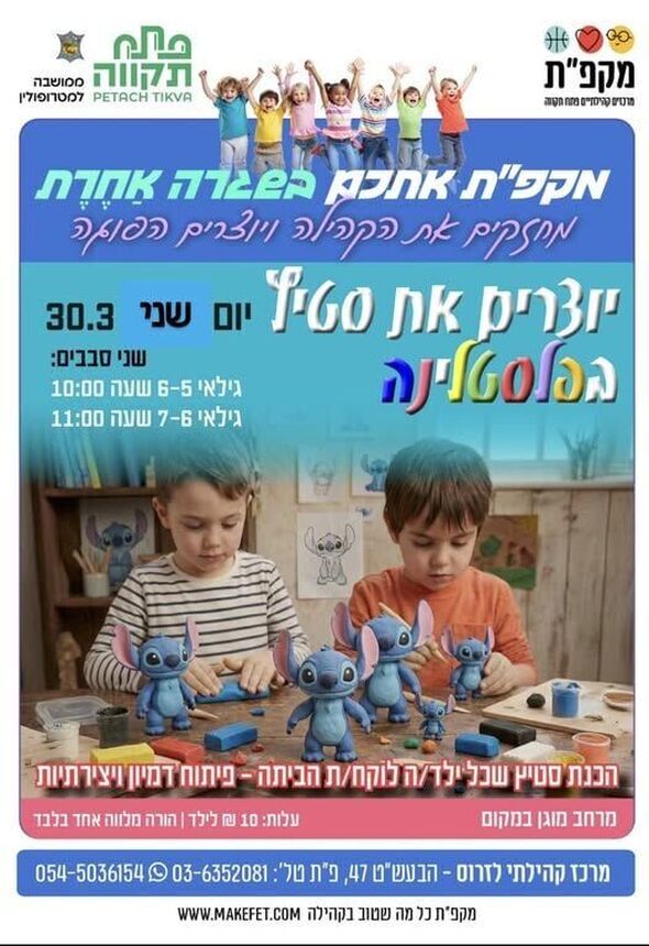 תאגיד מקפ"ת ממשיך לעמוד לצד התושבים גם כעת, ומזמין את הילדים לסדנת יצירה חווייתית במרכז קהילתי לזרוס שבפתח תקווה. במסגרת הפעילות ייצרו המשתתפים מפלסטלינה את הדמות האהובה "סטיץ'", בסדנה ששמה דגש על פיתוח הדמיון והיצירתיות, ובסיומה כל ילד וילדה יוכלו לקחת את יצירתם הביתה.