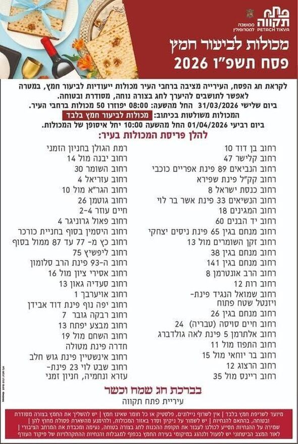 עיריית פתח תקווה נערכת לקראת חג הפסח, ובמטרה לאפשר לתושבים לקיים את מצוות ביעור החמץ בצורה נוחה, מסודרת ובטוחה, יוצבו ברחבי העיר כ-50 מכולות ייעודיות לביעור חמץ.