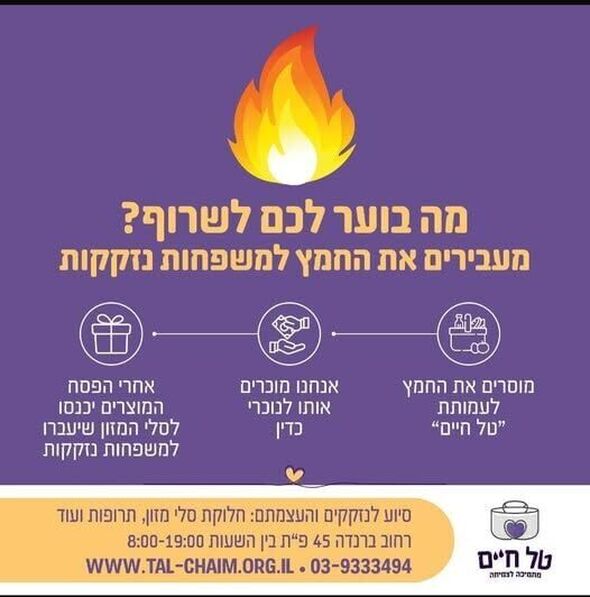 לקראת חג הפסח, עמותת "טל חיים" בפתח תקווה יוצאת במיזם חברתי במסגרתו ייאספו מוצרי חמץ במטרה להעבירם למשפחות נזקקות ולנתמכי העמותה לאחר ימי החג. במקום לבער או לזרוק את החמץ הנותר בבתים, הציבור קורא להעביר מוצרים סגורים כגון פסטות, אטריות, שימורים ומזון יבש נוסף למרכז האיסוף.