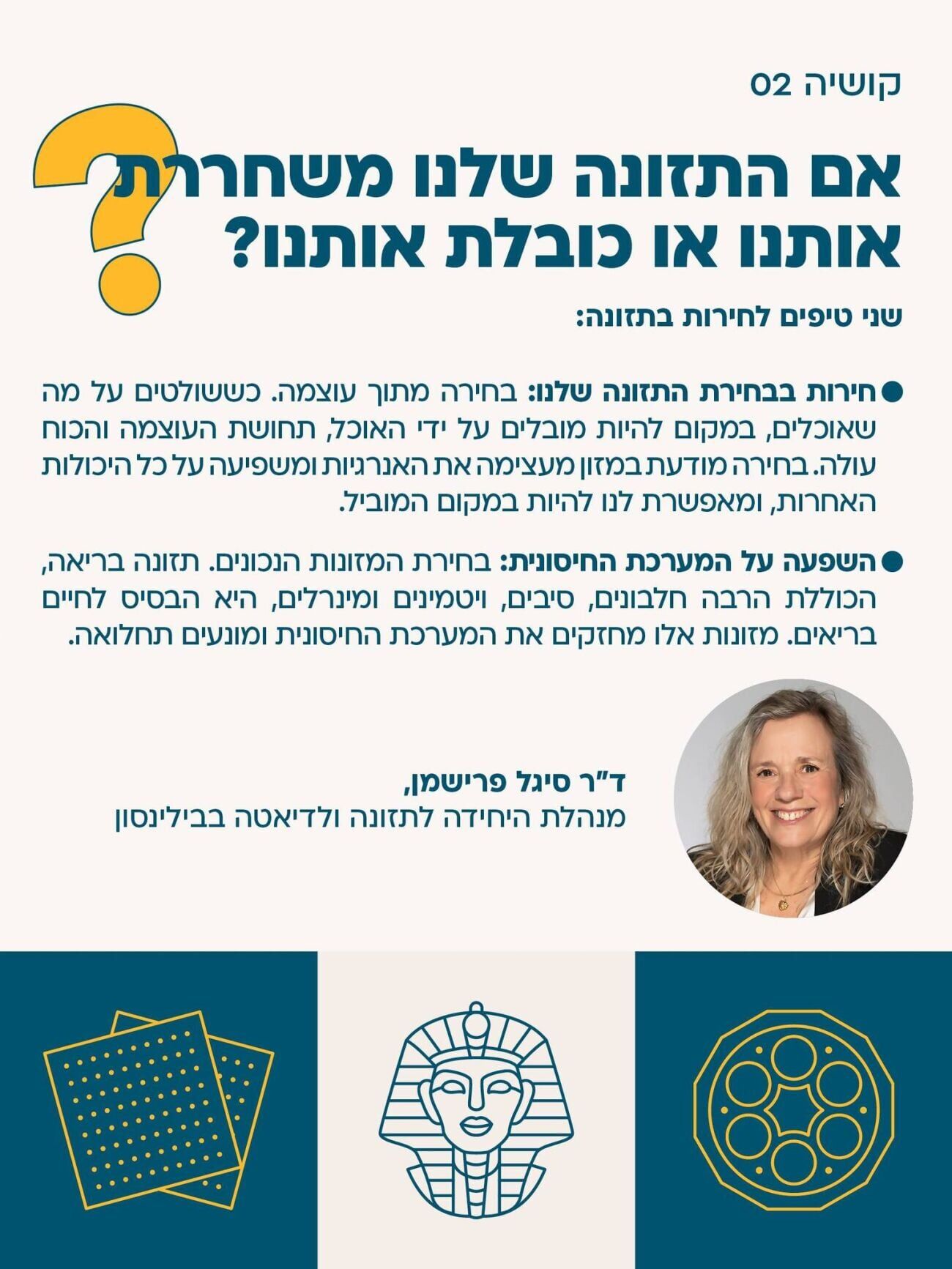 ד"ר סיגל פרישמן, מנהלת היחידה לתזונה ולדיאטה בבית החולים, מסבירה כי חירות תזונתית משמעה בחירה מתוך עוצמה ושליטה על המזון. שליטה זו מעצימה את האנרגיות ומשפיעה על תחומים נוספים בחיים. בנוסף, היא מדגישה את חשיבות הבחירה התזונתית לחיזוק המערכת החיסונית, באמצעות צריכת חלבונים, סיבים, ויטמינים ומינרלים, המהווים בסיס לחיים בריאים ומונעים תחלואה.
