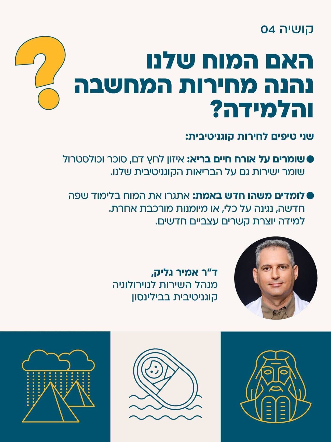 לדברי ד"ר אמיר גליק, מנהל השירות לנוירולוגיה קוגניטיבית, השמירה על כושר המוח תלויה רבות באורח החיים. ראשית, איזון לחץ דם, סוכר וכולסטרול משפיע באופן ישיר על הבריאות הקוגניטיבית. מומלץ גם לאתגר את המוח דרך למידת מיומנות מורכבת וחדשה – כמו שפה זרה או נגינה, אשר מייצרת קשרים עצביים חדשים ותורמת לחיוניותו של המוח.