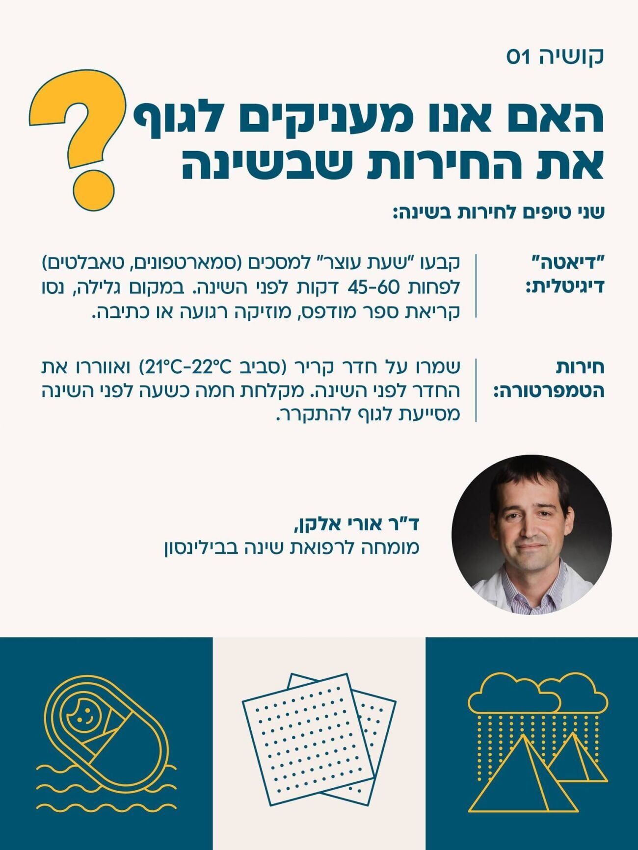 ד"ר אורי אלקן, מומחה לרפואת שינה בבילינסון, מציע שני טיפים מרכזיים. הראשון הוא "דיאטה דיגיטלית" – קביעת שעת עוצר למסכים כגון סמארטפונים וטאבלטים, לפחות 45-60 דקות לפני השינה. במקום זאת מומלץ לקרוא ספר מודפס, להאזין למוזיקה רגועה או לכתוב. הטיפ השני מתייחס לטמפרטורת החדר: יש לשמור על חדר קריר בסביבות 21 עד 22 מעלות ולדאוג לאוורורו כשעה לפני השינה. בניגוד למה שנהוג לחשוב, מקלחת חמה לפני השינה דווקא מסייעת לגוף להתקרר.
